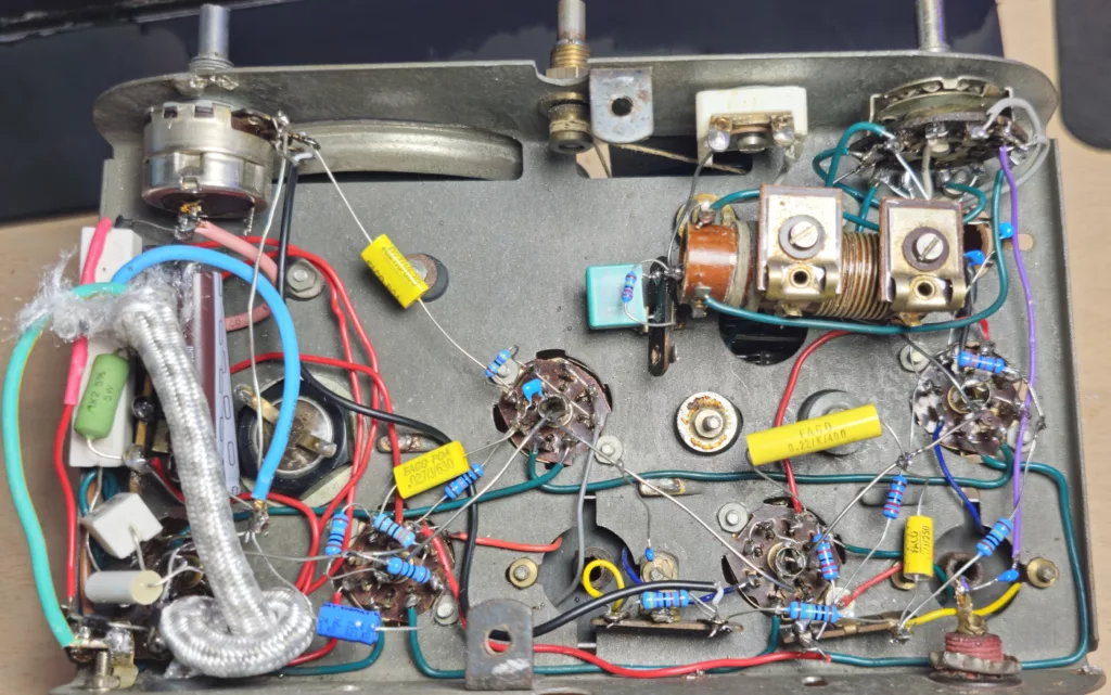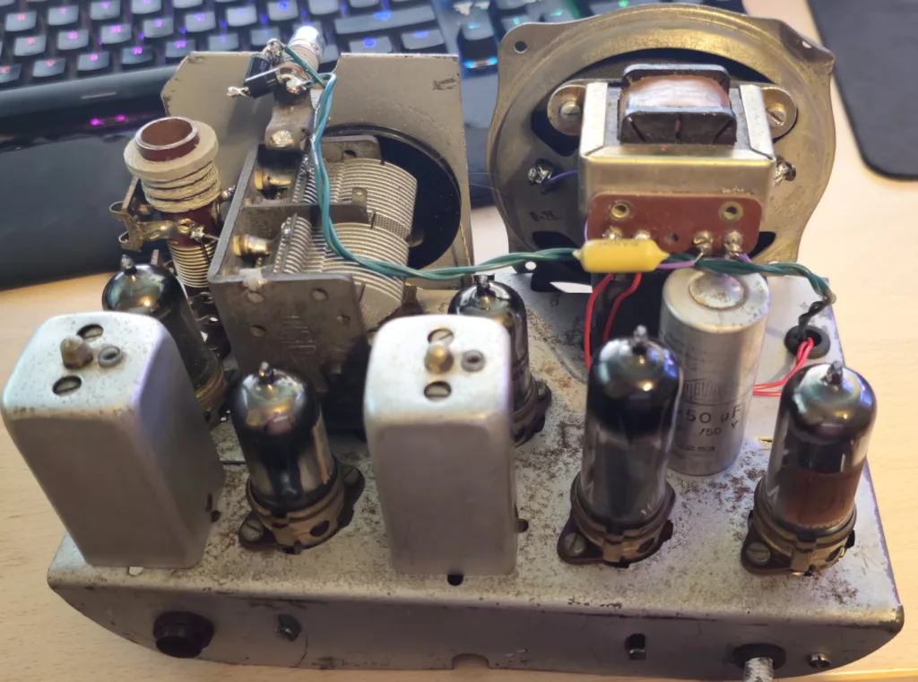 - La radio ha sido parcialmente restaurada por alguien. Ha sustituido los electrolíticos y el condensador de papel de 10nF de la reja de control de la UL4, para evitar que las fugas del condensador original destruyesen esta válvula. Sin embargo, hay otros condensadores de papel que ha dejado intactos.