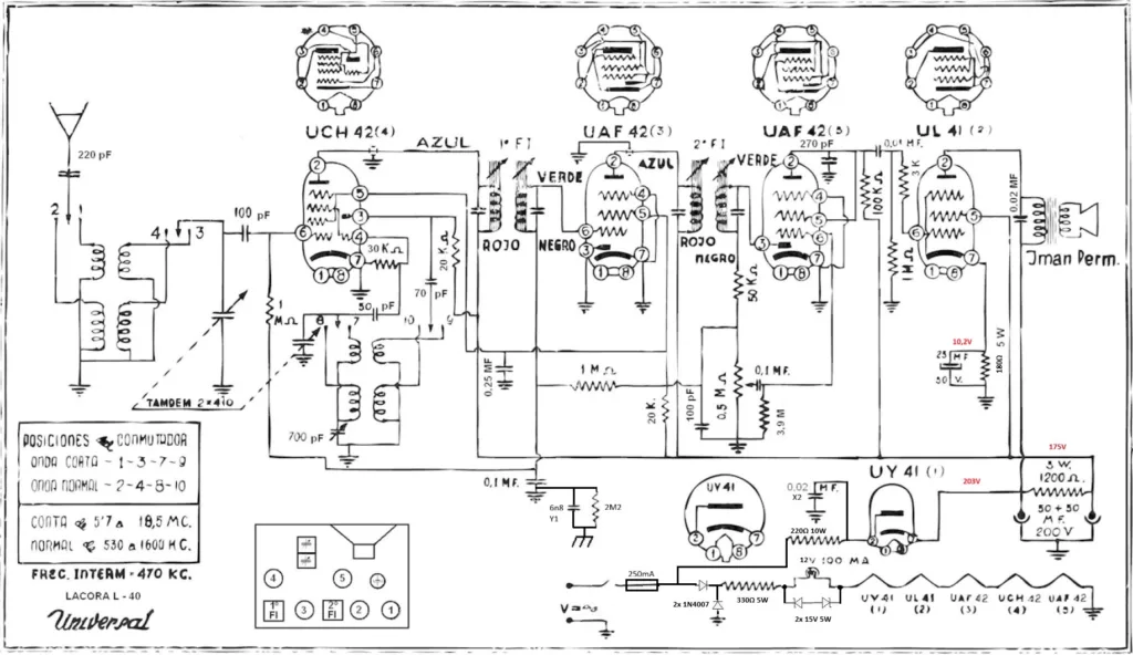 Como nota interesante, esta radio no es una Lacora L-40 pura… ¡Realmente se trata de una mezcla de un Lacora L-40 con un kit Bertrán 201! Lo delatan que sus componentes son de radio Bertrán y que el bloque de bobinas es el que corresponde con el que usa su esquema particular: