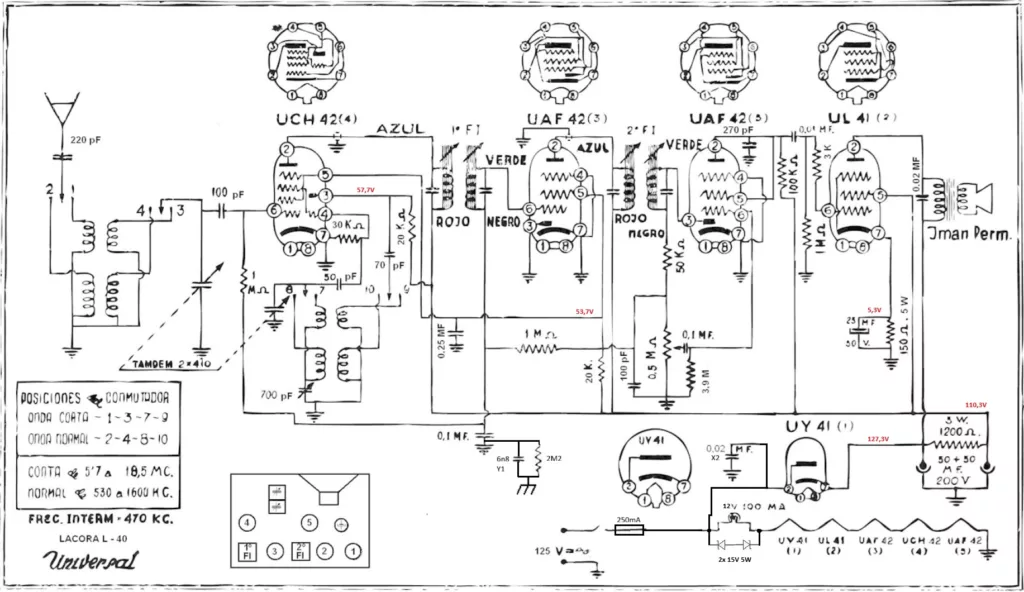 Se puede ver cómo es un diseño bastante estándar y simple. Como la mayoría de radios de esta época, y especialmente las universales, está pensada para funcionar con una red de 125V.